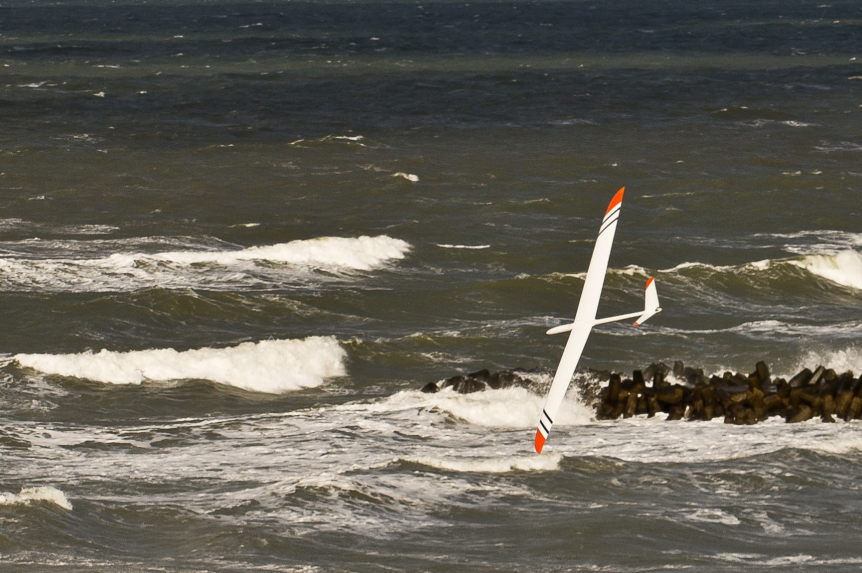 Der Montag bescherte uns wie vorhergesagt schönen Westwind mit Stärke 6 in Böen, auch einige 8ter waren dabei, also genau das richtige Wetter für den Erstflug der Slopy. Gesteuert von einem unserer erfahrensten Piloten, wurde der voll ausbalancierte Slopy über die Kante befördert. Vom ersten Moment flog er zuverlässig und gut kontrollierbar, lediglich die Ausschläge wurden nach den Wünschen des Piloten angepasst.
